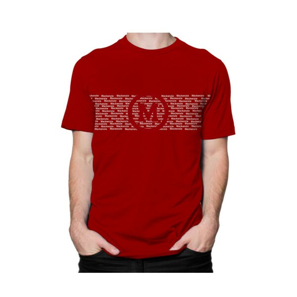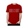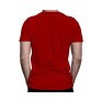 Camiseta desenvolvida em tecido de malha vermelha e estampada em silk branca. Sem estampa nas costas. Possui etiqueta de tafetá nas costas. Gola redonda canelada 2x1 2 cabos pespontada na máquina de cobertura, tapa costura na gola com reforço de ombro a ombro, punho e barra com costura dupla. Composição: 100% Algodão